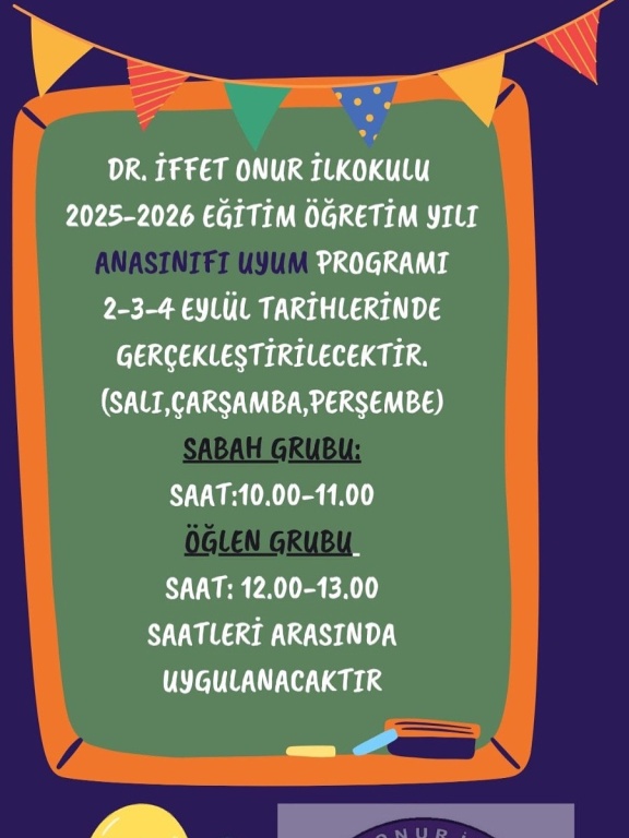 Okul öncesi eğitim yolculuğuna başlayacak miniklerimiz için uyum programımız 2-3-4 Eylül 2025 tarihlerinde (Salı, Çarşamba, Perşembe) uygulanacaktır.